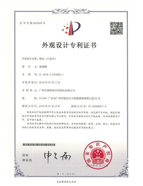 معيار:Design patent (HG001) عدد:ZL 201720440167.9 تاريخ القضية:2017-04-25 نطاق / متوسط:one structure of lock صدر عن:SIPO |